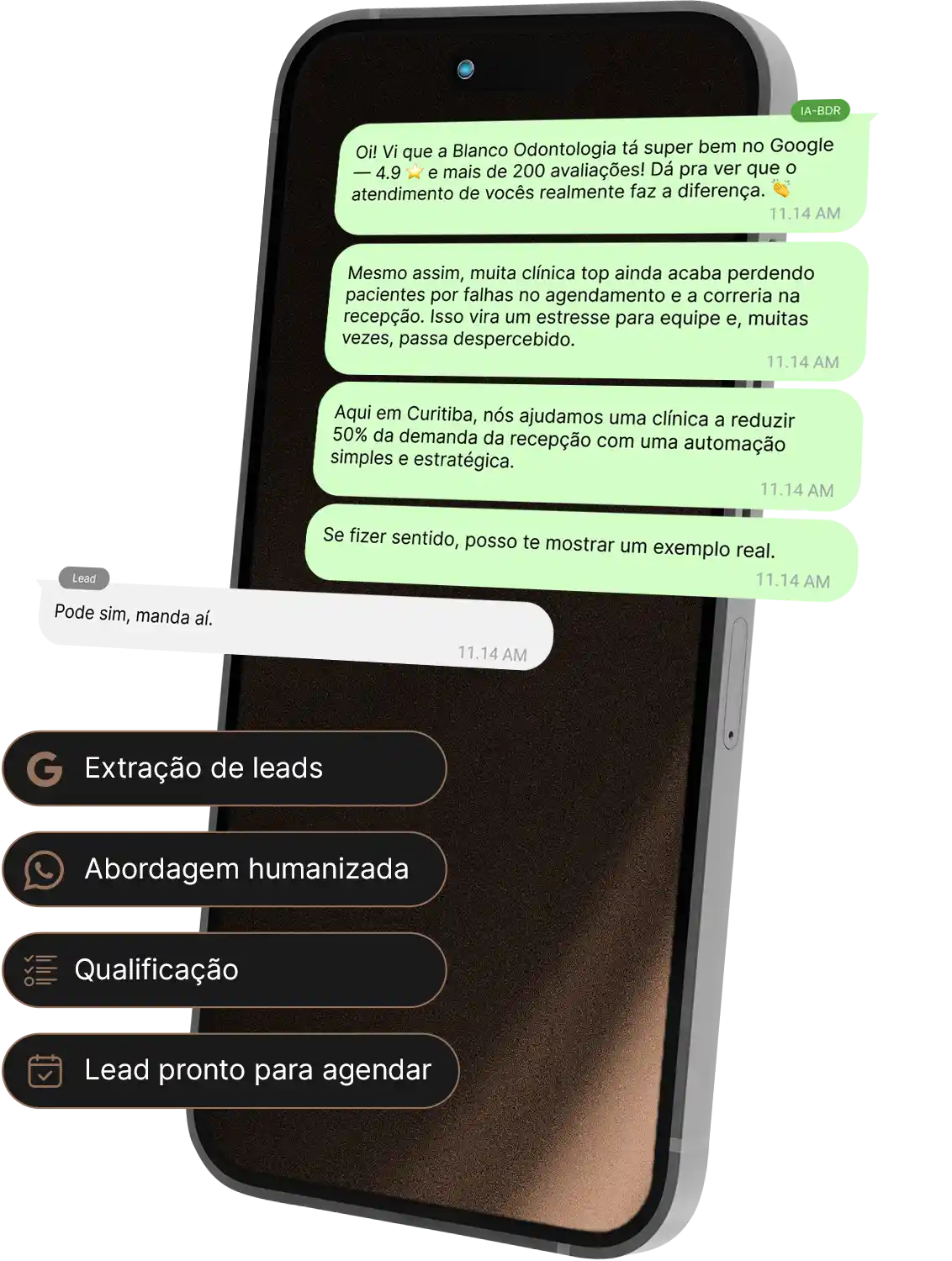 Mensagens com contexto real sobre o lead — nada de templates frios ou genéricos que ninguém responde.